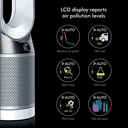 - Automatically senses and reports air quality levels (PM 2.5, PM 10, VOC, NO2 & overall AQI) on LCD screen and Dyson Link App in real-time; only purifier to report ALL of these separately.